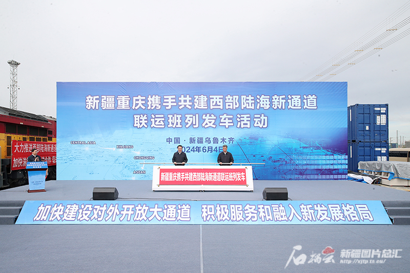 6月4日,重庆市委书记袁家军,自治区党委书记、兵团党委第一书记、第一政委马兴瑞共同为新疆重庆携手共建西部陆海新通道联运班列启动发车。石榴云/新疆日报记者 崔志坚 摄